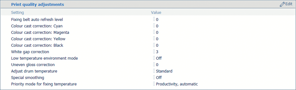 Ustawienia regulacji jakości wydrukuUżyj opcji [Poziom automatycznego odświeżania pasa utrwalacza] do dostosowania frekwencji i czasu używanego do odświeżenia paska mocującego.