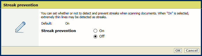 Ustawienia regulacji jakości skanowaniaWyłącz ustawienie [Zapobieganie smugom], by móc skanować dokumenty z bardzo cienkimi liniami.