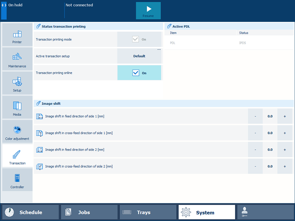 The transaction printing setup is activated by the IPDS or PCL data stream.