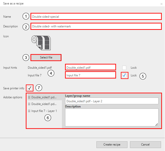 Se si vuole usare la funzione in PRISMAguide XL Extensions usare il campo [Descrizione] per aggiungere istruzioni per i progettisti sulle modalità di preparazione dell'illustrazione. PRISMAguide XL Extensions definire i nomi e le descrizioni dei layer/gruppi. Per esempio, si può aggiungere a 'File di input' la [Descrizione]: Filigrana. |
