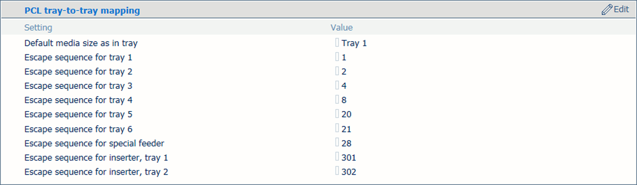 トレイtoトレイモードでは、この設定を有効にすると、デフォルトのトレイマッピングテーブルが使用されます。この標準のトレイマッピングテーブルは変更できません。 |