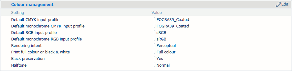 選択したデフォルトのレンダリングインテントは、レンダリングインテントと入力プロファイルが指定されていないジョブに対してのみ使用されます。 |