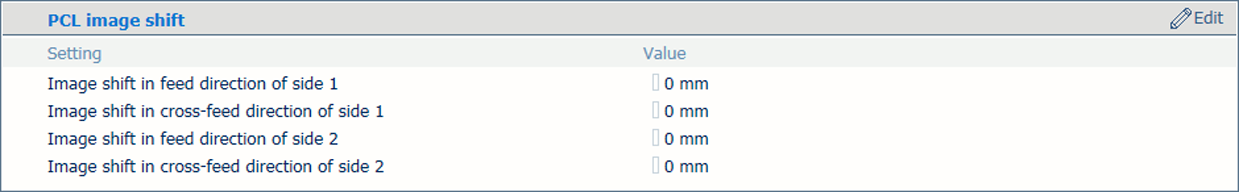 これらの属性は、画像シフトの定義に使用します。特定のテキスト用にマークされた領域があるプレプリント用紙を使用する場合、位置ずれが発生する可能性があります。またこの属性は、名前やアドレスなど、ページ上の可変データをより適切に配置するのにも役立ちます。用紙の1面と組み合わせる給紙方向および交差する方向の属性があります。 画像シフトは操作パネルで調整することもできます。 |
