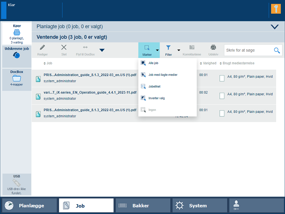 Med funktionen [Rediger ved brug af automatisk arbejdsgang] du kan anvende en automatiseret arbejdsproces eller redigere med automatiserede arbejdsprocesser, når du sender et eller flere PDF-job på kontrolpanelet eller på PRISMAremote Manager / PRISMAsync Remote Manager Classic. Denne funktion er tilgængelig i jobkøerne (lister over planlagte job og ventende job) og i DocBox-mappen. Jobbene modtager de nye opdaterede indstillinger, når du har angivet og bekræftet dem.