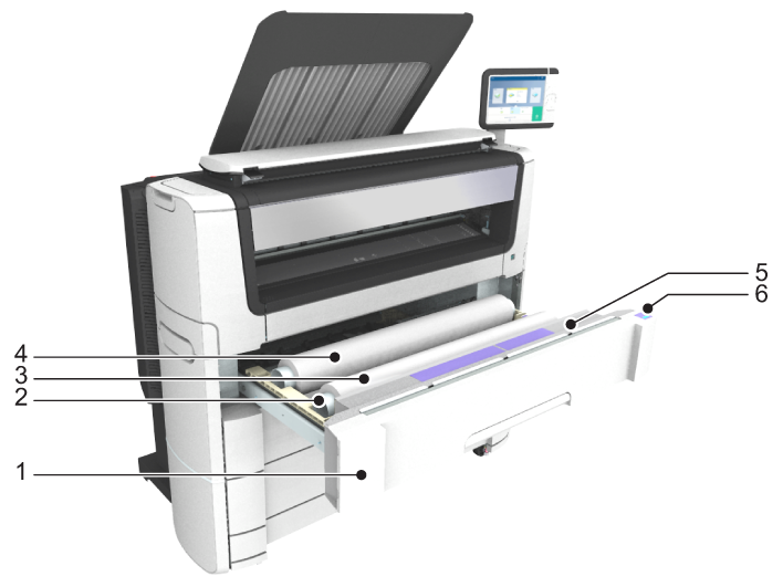 装有介质卷轴 1 和 2 的介质盒。装有介质卷轴 3 和 4 的下面第二个介质盒。装有介质卷轴 5 和 6 的下面可选第三个介质盒。