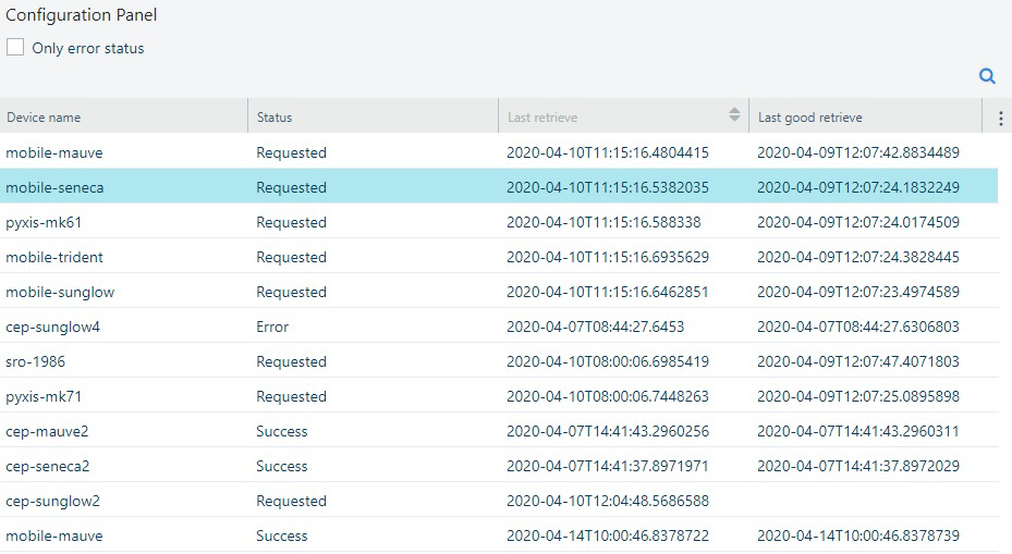 此工作区显示一个日志,其中包含每个已注册设备的数据检索操作的最新结果。