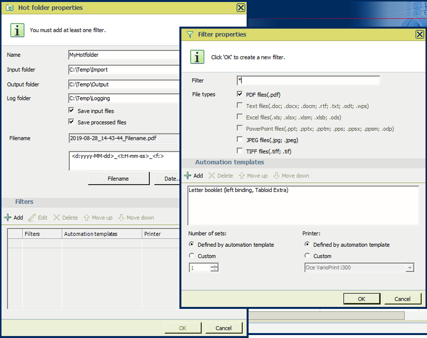 Click [Add] to add a filter. In this exercise, all files should be processed by the hotfolder. Type '*' as filter.