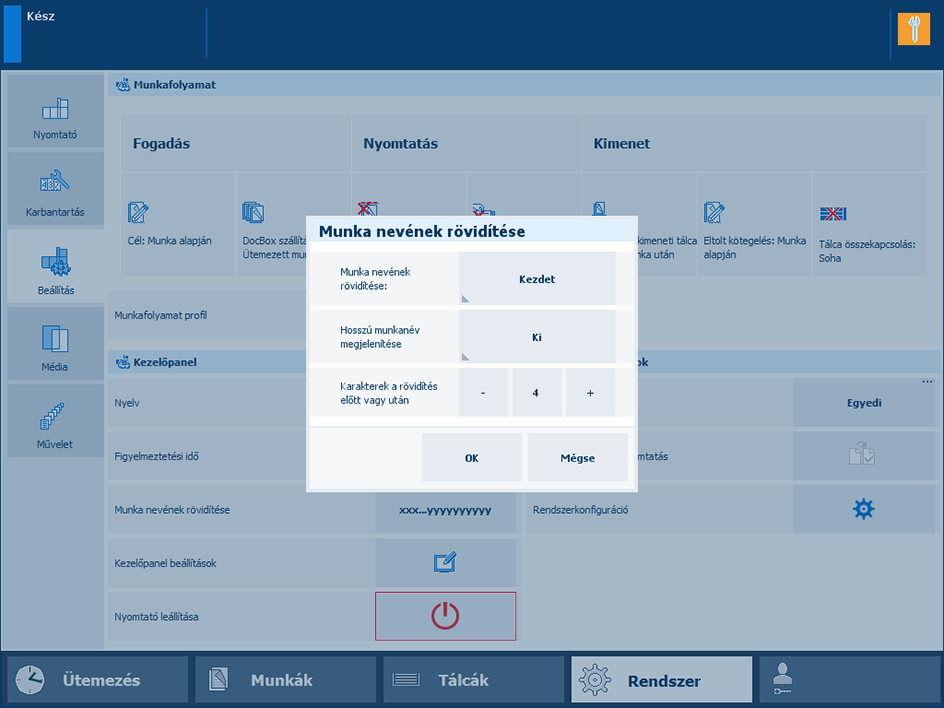 Érintse meg a [Rendszer] -> [Beállítás] -> [Munka nevének rövidítése] gombokat.