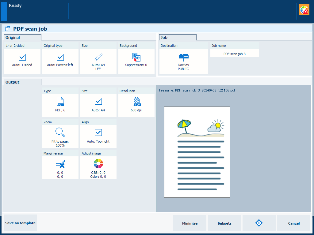 The scan function contains a number of factory default templates to create a digital document from originals. When you select a template, PRISMAsync automatically uses scan and original settings for the job. You can change each individual setting of a template and define your own templates.