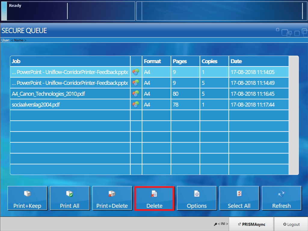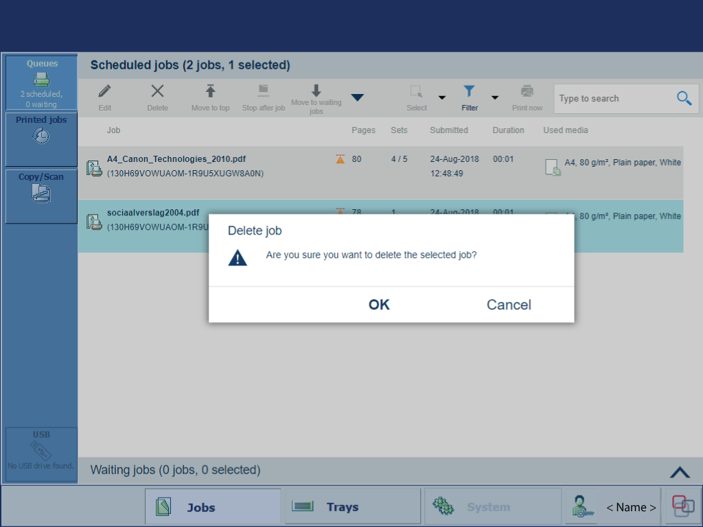 Velg jobben(e) du vil slette på skjermen for sikker kø.