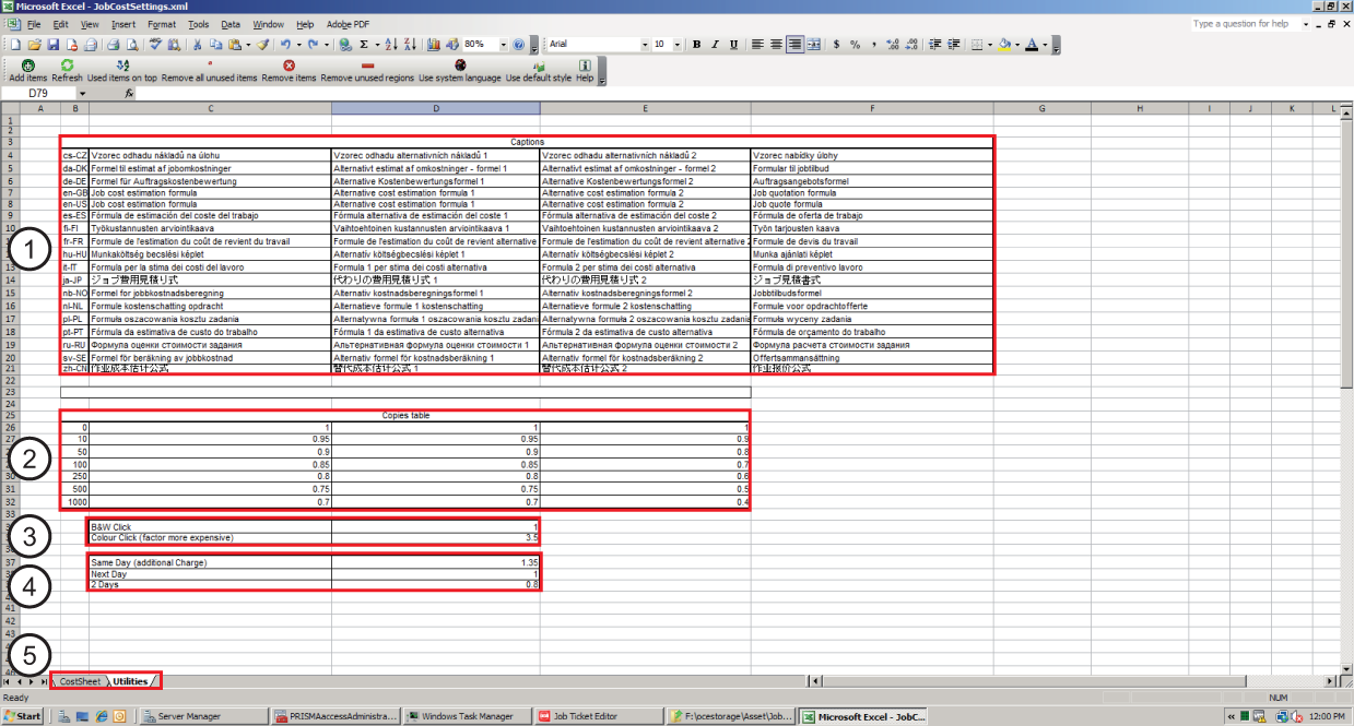 A tabela [Legendas] Os nomes traduzidos das fórmulas da folha de cálculo "CostSheet" são obtidos da tabela [Legendas] na folha de cálculo "Utilities". As [Legendas] podem ser modificadas para cada idioma e as alterações serão apresentadas na loja Web. A tabela de [Legendas] é definida como um Named Range. O nome do Named Range é [CostCaptions]. Utilize a função VLOOKUP para utilizar os valores em Named Range numa fórmula. Named Ranges e a função VLOOKUP são descritos no ficheiro de ajuda do Microsoft Excel. |
