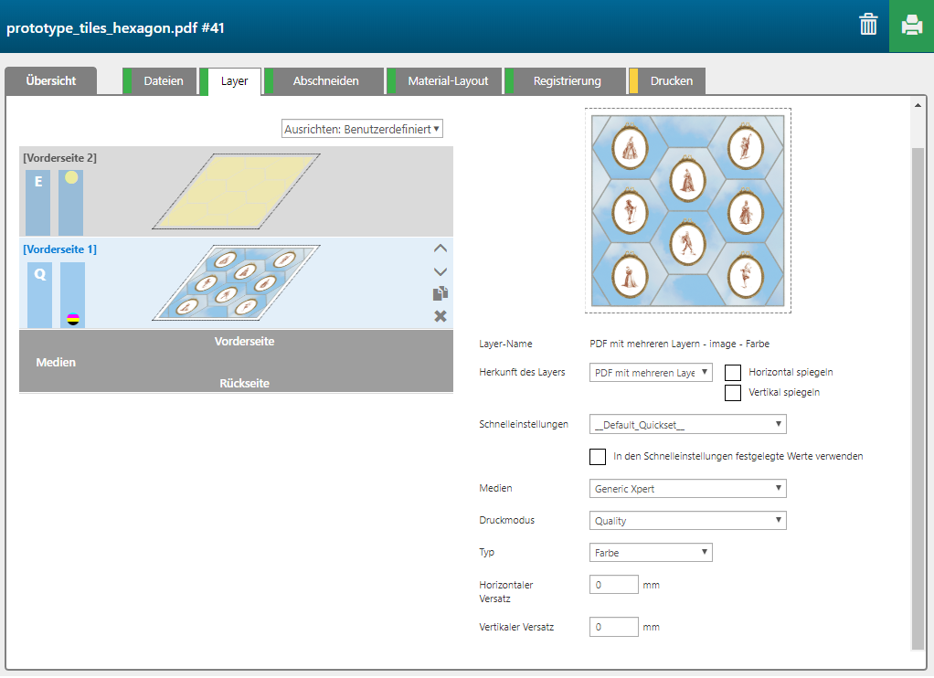 Die Rezeptur 'Prototype tiles' enthält 2 Layer, die auf die Vorderseite des Materials gedruckt werden.