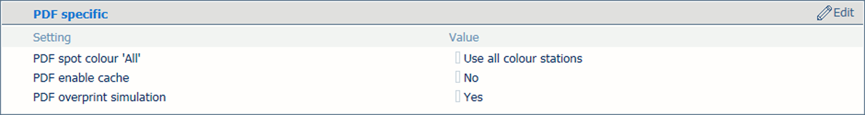 PDF data have a number of pre-defined spot color names. The color name 'All' means that the RIP uses a 100% coverage of all the available colors. The color 'All' is intended for alignment marks. You can force the RIP to only use 100% black. Note that if the printer supports a separate MICR station, the color name 'All' implies that MICR pixels are used as well. |