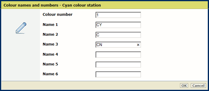 Enter a unique value (1-254) to specify every color station except the K station, to enable a color selection by a number. The Black color station has the value of zero and cannot be edited. The other default color numbers are: