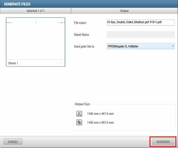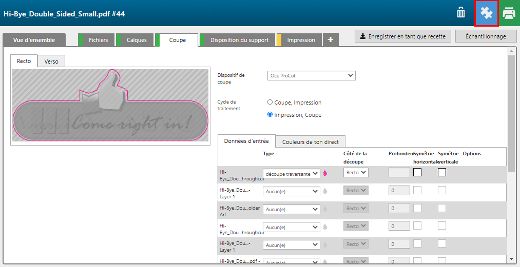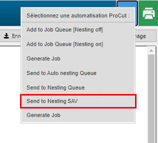 Choisissez Send to nesting SAV (Envoyer pour imbrication en vinyle autocollant). Le travail est envoyé à la queue d'imbrication dans ProCut Prepress.