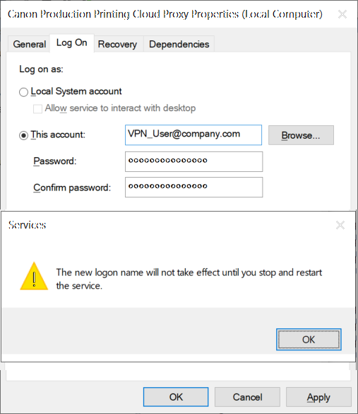 Le compte par défaut est « Système local », mais lorsque vous utilisez la connexion VPN, vous utilisez votre compte local. Cela doit être modifié sur votre compte Windows personnel.
