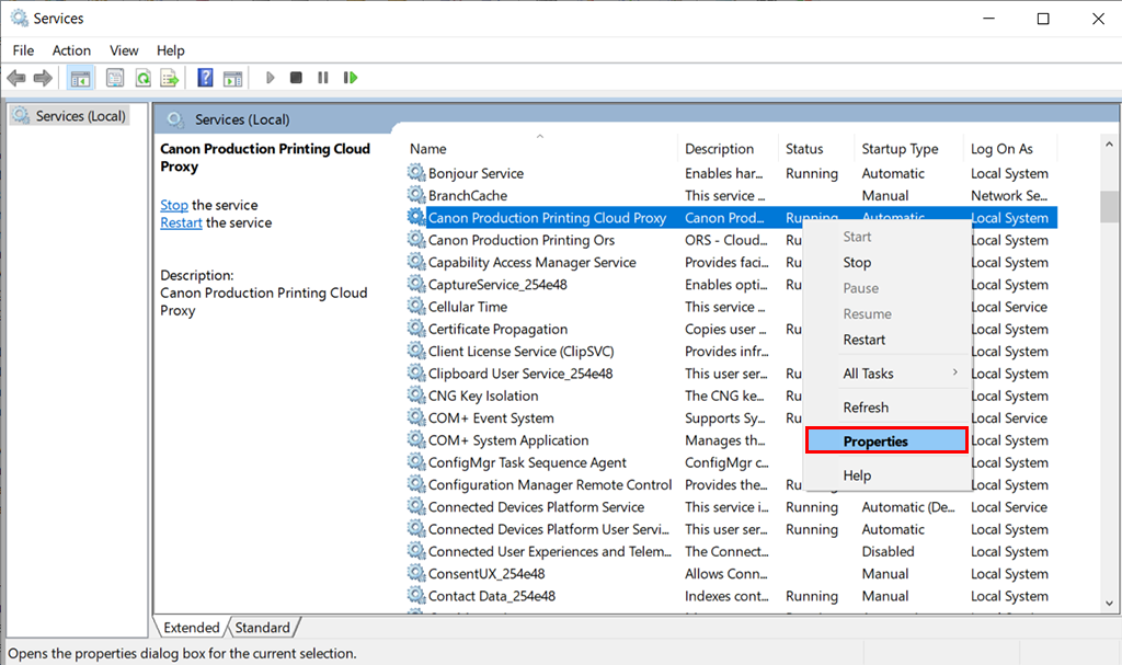 Cloud Proxy 서비스를 마우스 오른쪽 버튼으로 클릭하고 "Properties(속성)"를 선택합니다.