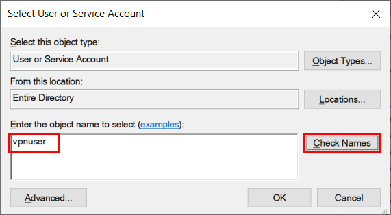 Windows 로그온 이름(이 예에서는 "VPNuser")을 사용하고 "Check Names(이름 확인)"를 클릭합니다.