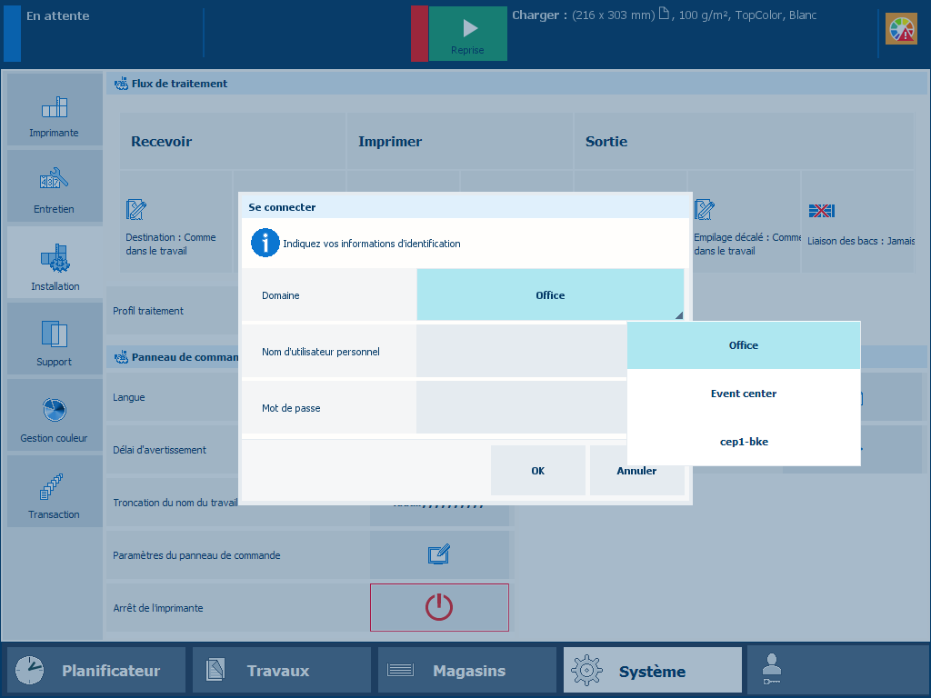 Connectez-vous avec un compte utilisateur défini en usineLorsque la liste déroulante [Domaine] s’affiche, sélectionnez le nom d’hôte ou l’adresse IP de l’imprimante.