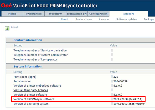 PRISMAsync Print Server mark 7.1 or higher*. The PRISMAsync mark level can be found within the settings editor in the Support/About tab.
