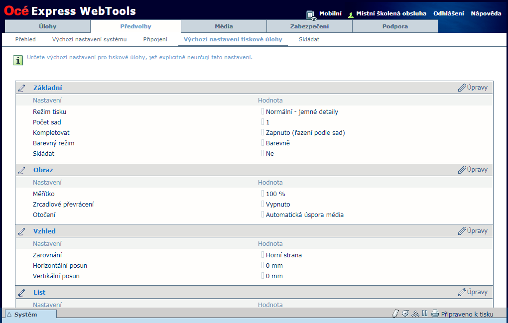 Hodnoty definované na kartě [Předvolby] - [Výchozí nastavení tiskové úlohy] aplikace Océ Express WebTools jsou výchozí nastavení určující obecné chování systému. Pravidla těchto nastavení se změní, pokud změníte příslušná nastavení úloh v tiskovém ovladači, aplikaci pro odesílání úloh nebo prostřednictvím uživatelského panelu.