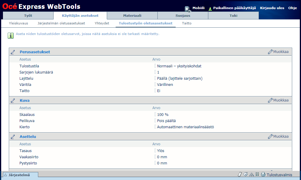 [Käyttäjän asetukset] - [Tulostustyön oletusasetukset] -välilehdellä määritetyt arvot Océ Express WebTools -sovellukselle ovat tulostustöiden käsittelyn oletusarvoja. Nämä asetukset ohitetaan, jos muutat vastaavia työasetuksia tulostusajurissa, työn lähetystyökalussa tai ohjauspaneelilla.