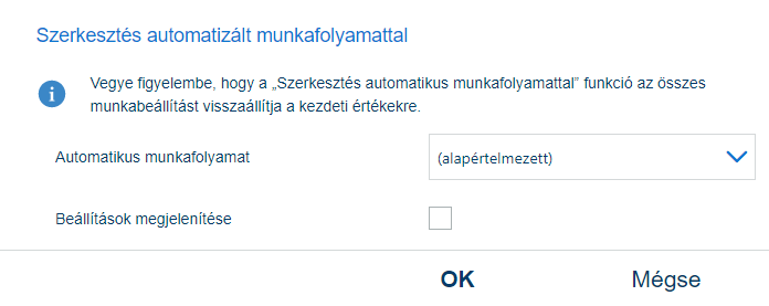 Vegye figyelembe, hogy a [Szerkesztés automatizált munkafolyamattal] funkció az összes munkabeállítást visszaállítja a kezdeti értékekre.