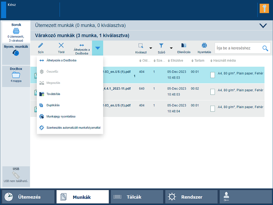 Ha előre definiált automatizált munkafolyamatot választ, és felülbírálja az engedélyezett munkajegyet, akkor az automatikus munkafolyamat beállításai további prioritást kapnak. Példa: a jegyen A3-as, az automatikus munkafolyamatban pedig A4-es média van beállítva => az eredmény A4-es média