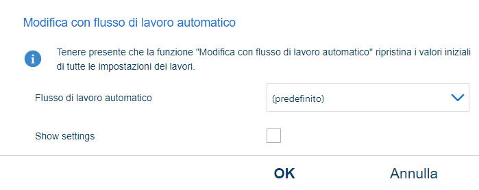 Per ripristinare le impostazioni dei lavori originali, lasciare [Flusso di lavoro automatico] l'elenco a discesa vuoto e fare clic su [OK].