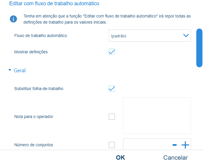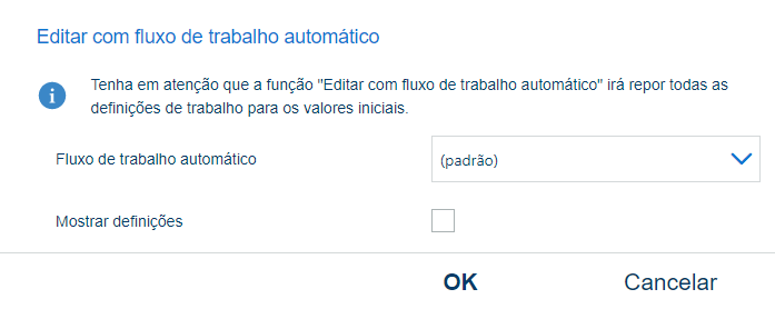 Para repor as definições de trabalhos originais, deixe a [Fluxo de trabalho automático] lista pendenteem branco e clique em [OK].