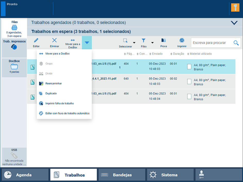 Os conflitos serão resolvidos. Os trabalhos serão impressos, exceto se tiver indicado que a impressora deve parar quando ocorrem trabalhos com definições em conflito. Nesse caso, terá de confirmar a alteração para continuar a imprimir.