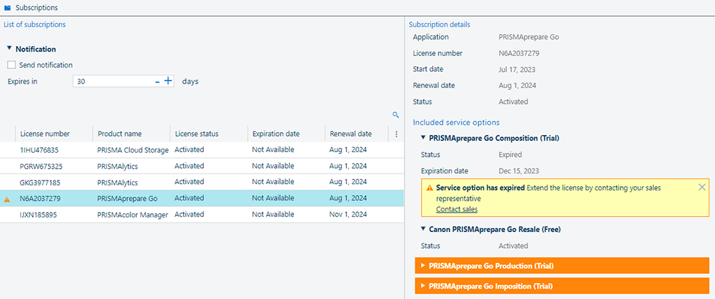 È possibile indicare a PRISMA configuration di inviare una notifica prima della scadenza di una sottoscrizione.