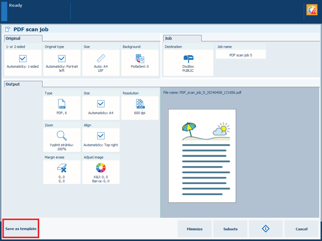 To store the settings of the last job in a custom template, touch the [Last used] template for two seconds.