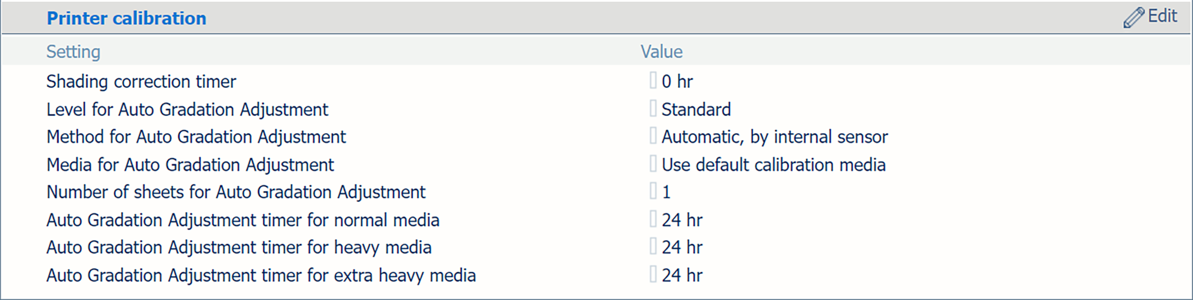 The [Level for Auto Gradation Adjustment] setting enables you to perform a calibration for each paper type group. If you select [Standard], the printer offers one calibration for all paper type groups. If you select [Professional (per paper type group)], the printer offers a separate calibration for each paper type group.