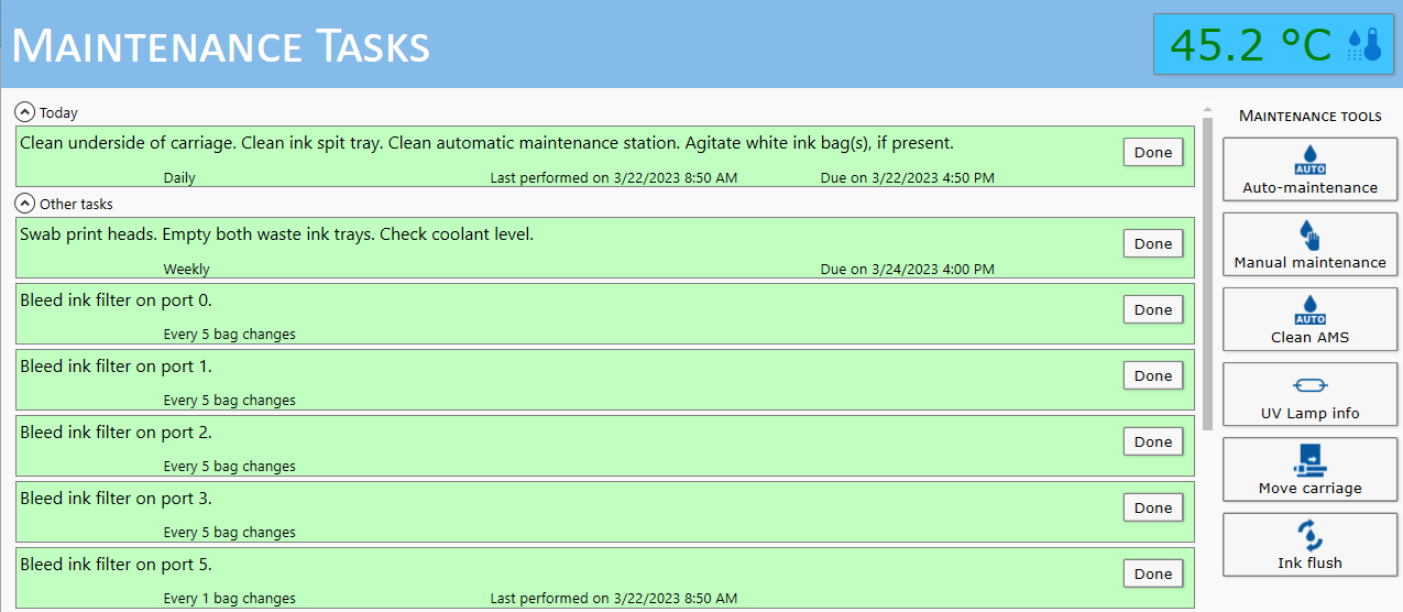 De multe ori, o duză se va regenera singură în timpul tipăririi. În cazul în care o duză nu se reface în urma unei operațiuni de spălare uscată a capului de imprimare sau a practicilor AMS standard, poate fi necesară recuperarea duzei prin această procedură: Purjare manuală a cernelii și curățarea capului de imprimare.