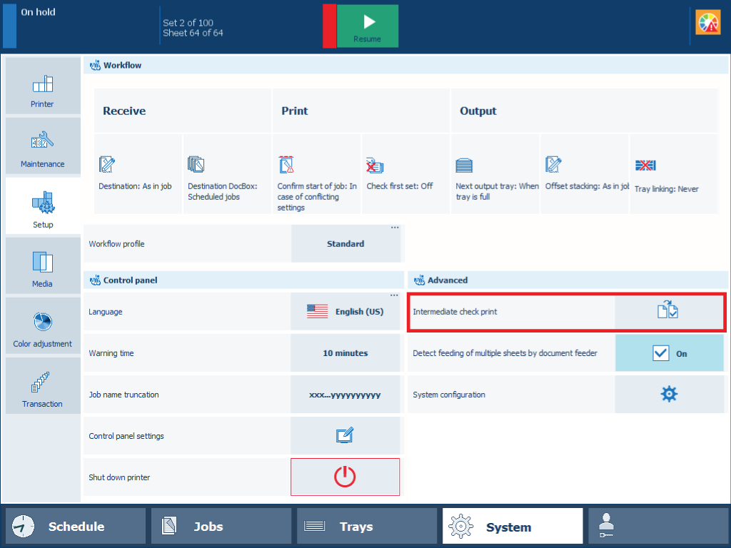 3. Use the [Interval of intermediate check print] setting to define the interval of intermediate check prints. The printing of intermediate check prints is disabled when the value is: 0.