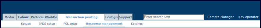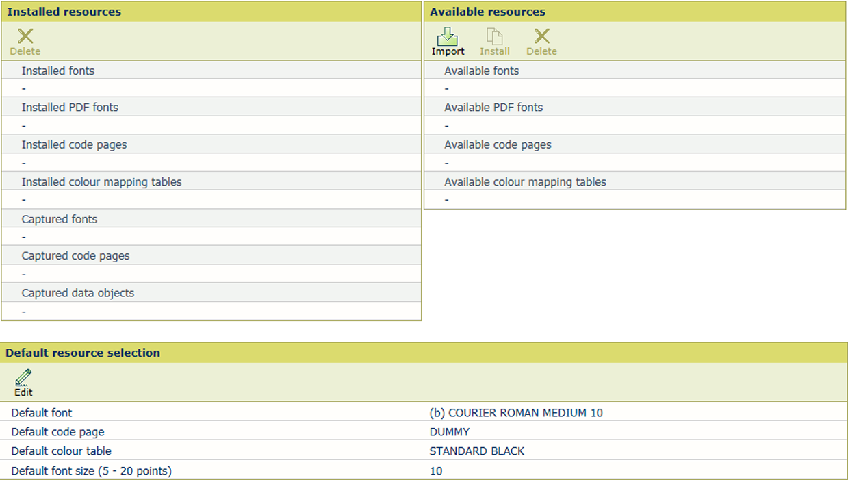 捕获的资源:所需的资源在打印机上不可用时,IPDS 主机可以下载资源。为了提高性能,下载的 IPDS 资源可以捕获在打印机磁盘上以供将来再次使用。IPDS 主机了解资源的可用性,但仍然需要激活资源。捕获的资源在 Settings Editor 中可见。仅当加载的交易设置中的 [字体捕获] 功能被设置为启用时,才会捕获资源。该设置也可控制捕获或安装的资源是否可供选择。请注意,由于 IPDS 主机的配置原因,下载的资源可能没有被捕获。