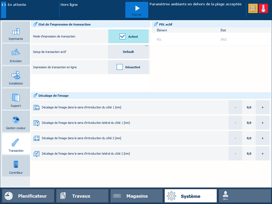 Utilisez le paramètre [Mettre l'impression de transaction en ligne ou hors ligne] pour mettre l’impression de transaction en ligne ou hors ligne.