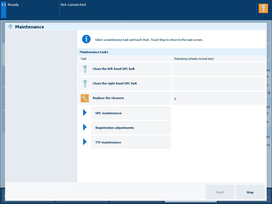 维护操作员可以执行用于清洁机器部件或提高图像质量的过程。此外,他们还负责通过控制面板执行机械维护任务和维护过程。