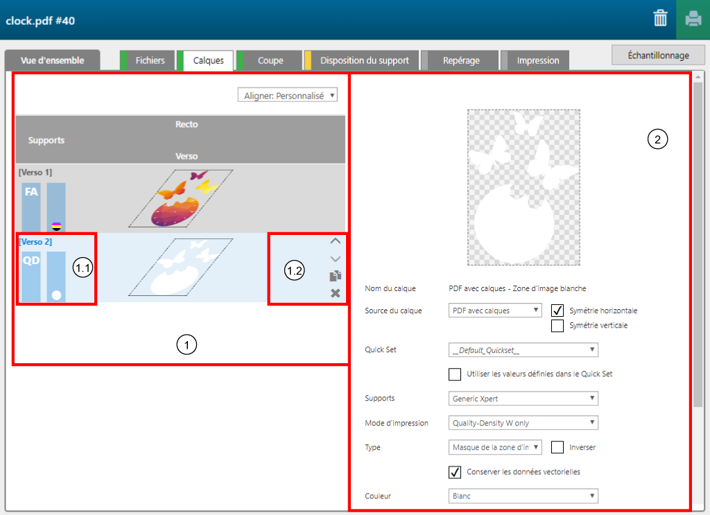 La totalité du contenu de la page PDF ou du calque est utilisée telle quelle (tons directs inclus) pour générer le calque d'impression.