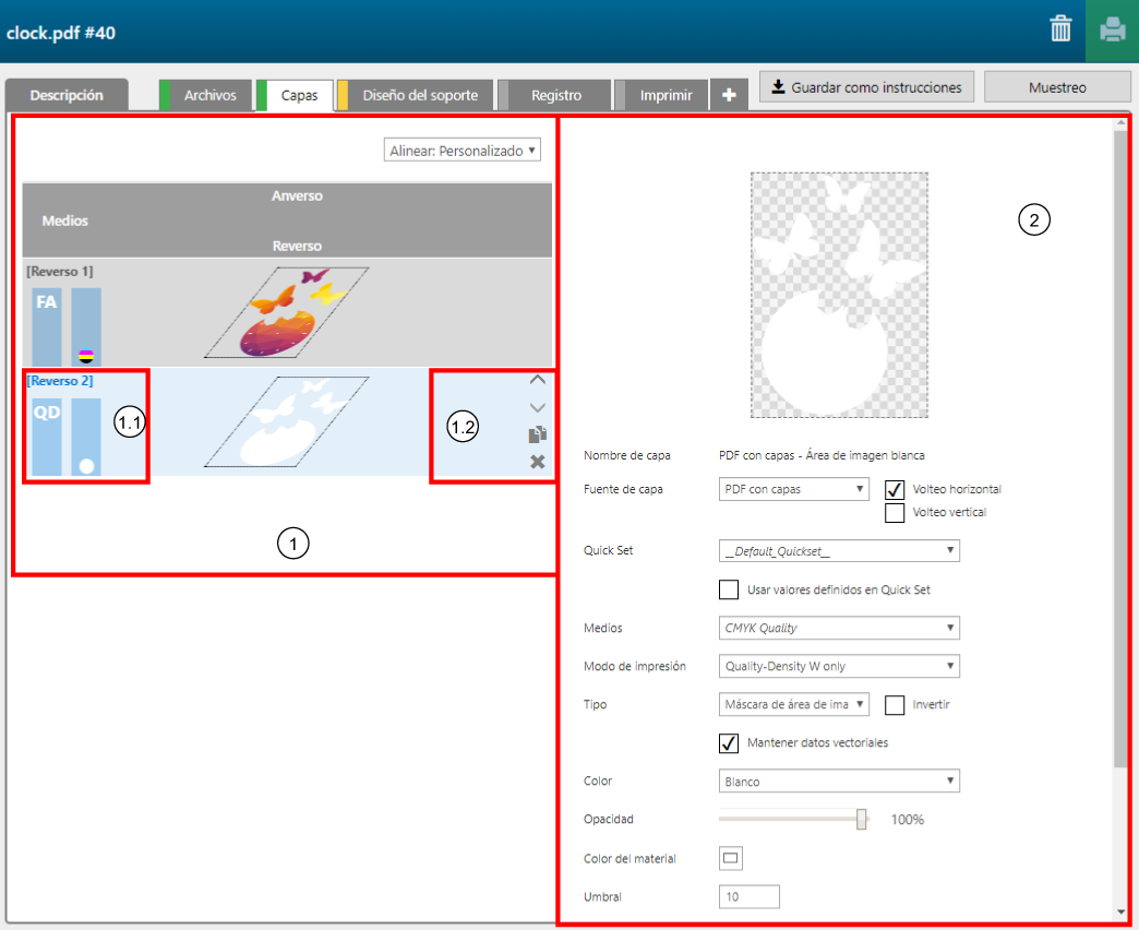 Cuando no se utiliza un juego Quick Set, el material y el modo de impresión asignados a la capa prevalecerán sobre los ajustes especificados en dicho juego. Puede seleccionar un juego Quick Set para una capa si desea configurar varios ajustes que están disponibles en ONYX Thrive, pero no son accesibles mediante la interfaz de usuario de PRISMAguide XL Engine.