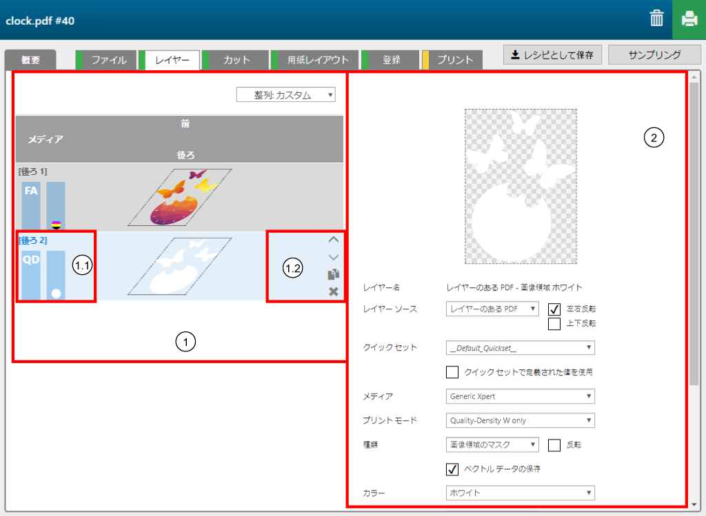 Quick Setを使用しない場合、クイックセットで定義された設定はレイヤーに定義したメディアと印刷モードで上書きされます。 ONYX Thriveで利用可能な複数の設定で構成したい場合、Quick Setをレイヤーに選択することができますが、PRISMAguide XL Engineユーザーインターフェースを経由してアクセスすることはできません。