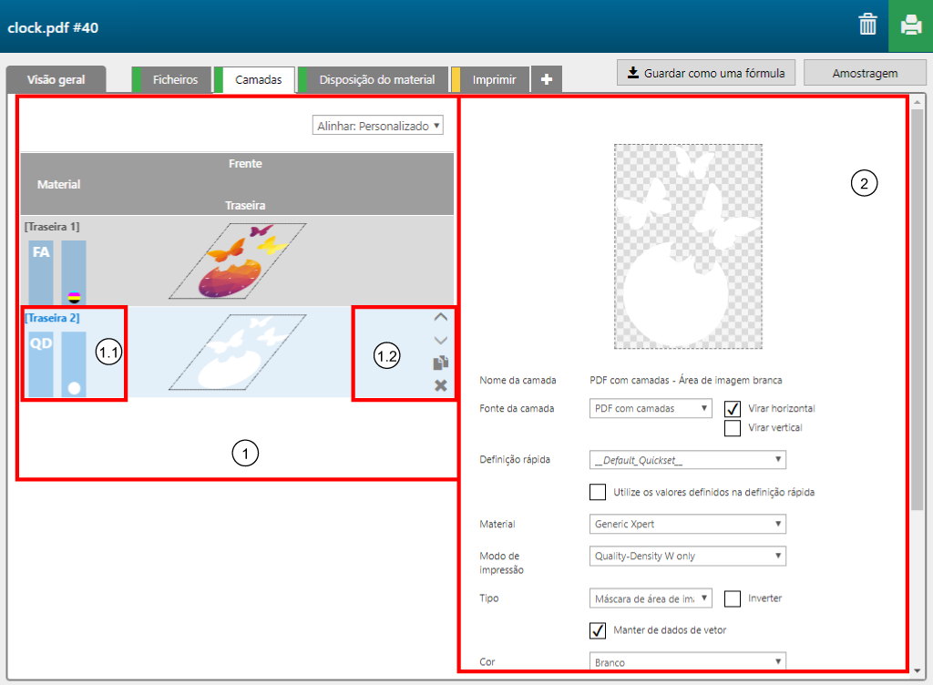 2. Pré-visualização da camada selecionada e definições de camada avançadas