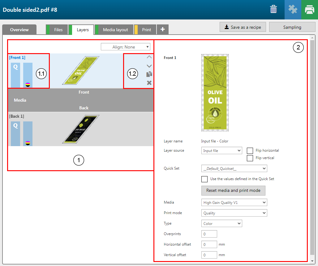 Wählen Sie in Ihrem Design die Seiten, Layer oder Vollfarben aus, die als Eingabe für den Layer in der Rezeptur verwendet werden soll. Wenn Sie eine Volltonfarbe als [Herkunft des Layers] verwenden, muss auf die Volltonfarbe in Ihrem Entwurf die Eigenschaft „Overprint“ angewendet werden. Vollfarbene Elemente mit Farbverläufen werden als Rasterbilder behandelt. Aktivieren Sie das Kontrollkästchen [Horizontal spiegeln] oder [Vertikal spiegeln], um die Informationen auf Ihrem Layer horizontal oder vertikal zu spiegeln. |