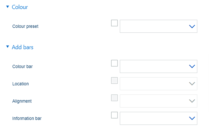 Quando quiser imprimir uma barra de cores, selecione uma das barras de cores disponíveis. Também pode selecionar a localização e o alinhamento. |