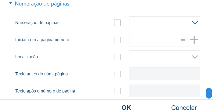 [Numeração de páginas], [Iniciar com a página número], [Localização], [Texto antes do número de página], [Texto após o número de página] |