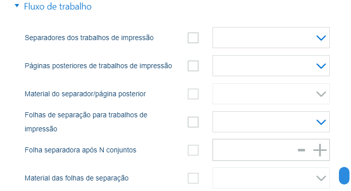 [Separadores dos trabalhos de impressão], [Páginas posteriores de trabalhos de impressão], [Material do separador/página posterior] |