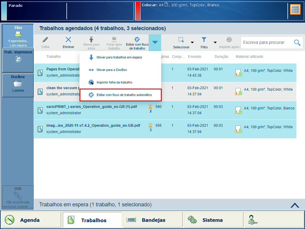 Na aplicação [Trabalhos], clique no botão [Fluxo de trabalho automático].