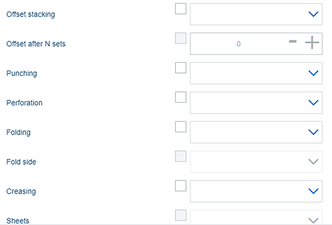 A função [Mostrar definições] oferece possibilidades de edição para todos os trabalhos selecionados. Não são apresentadas as definições do trabalho anterior, todos os campos na caixa de diálogo estão vazios. Quando é definido um valor nesta caixa de diálogo, será aplicado a todos trabalhos selecionados. As definições são semelhantes às definições do Editor de fluxos de trabalho automáticos, mas [Editar com fluxo de trabalho automático] não contém uma pré-visualização do trabalho, curvas CMYK, pré-visualização dos valores cromáticos dos píxeis e programação de páginas.