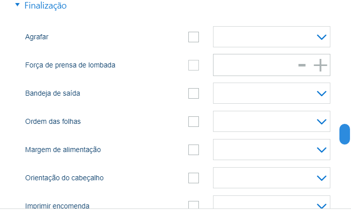 Defina o valor para agrafagem de lombada: Entre -10 e +10. |